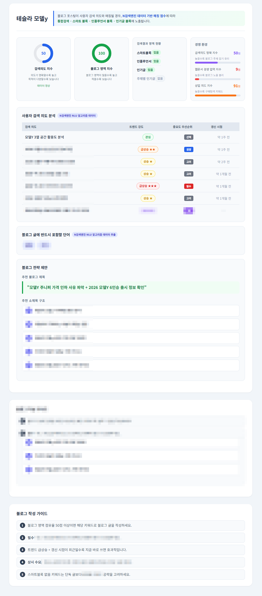 또한, “검색의도 지수 분석” 기능은 이러한 AI 글쓰기의 구조를 사용자도 직접 활용할 수 있도록 설계된 기능으로,