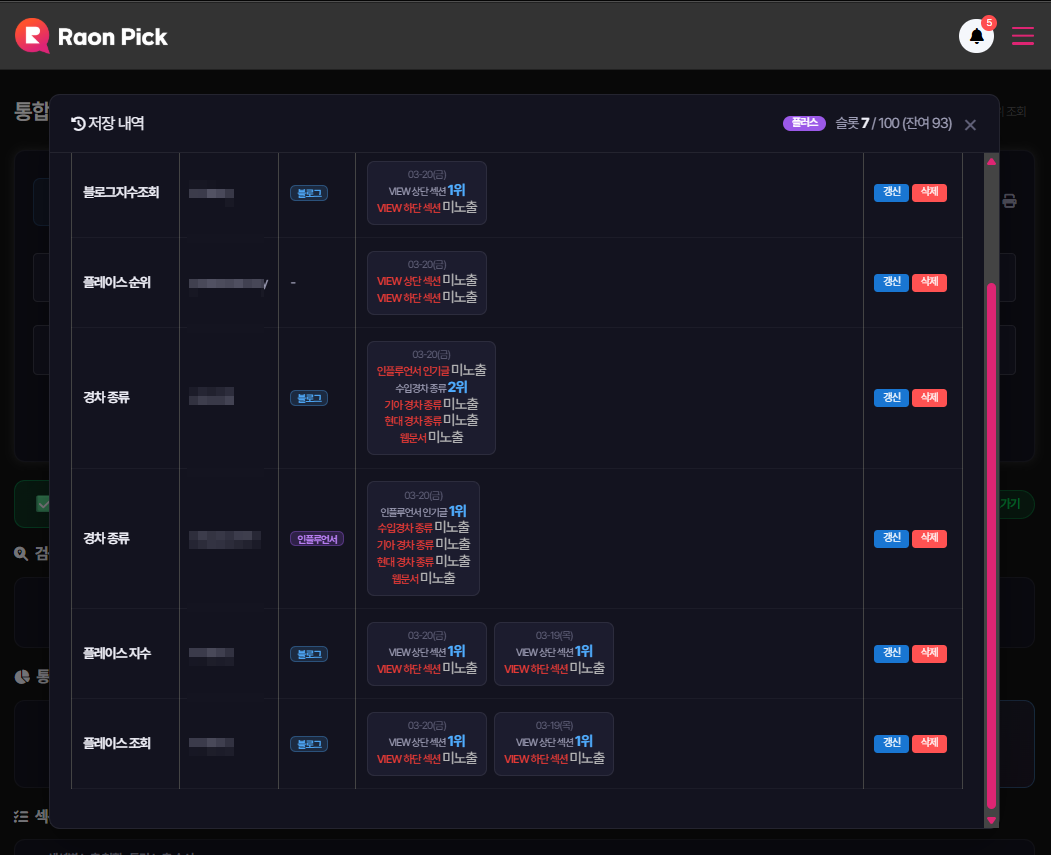 히스토리 열람 및 모니터링: 저장된 내역을 상시 열람하여, 특정 키워드의 노출 순위 하락 시 즉각적인 체크와 빠른 대응 전략 수립이 가능해졌습니다.