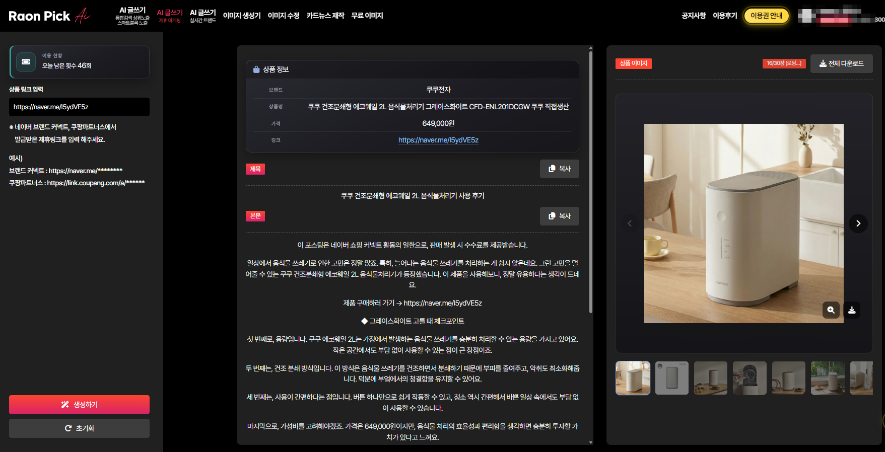 앞에 공지했던 라온픽 AI 글쓰기 제휴마케팅(브랜드커넥트,쿠팡파트너스)