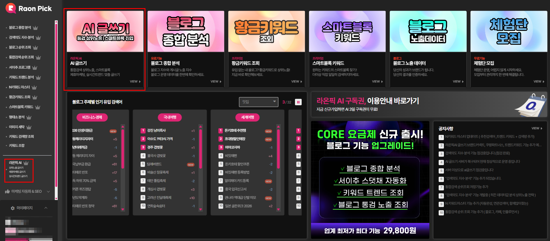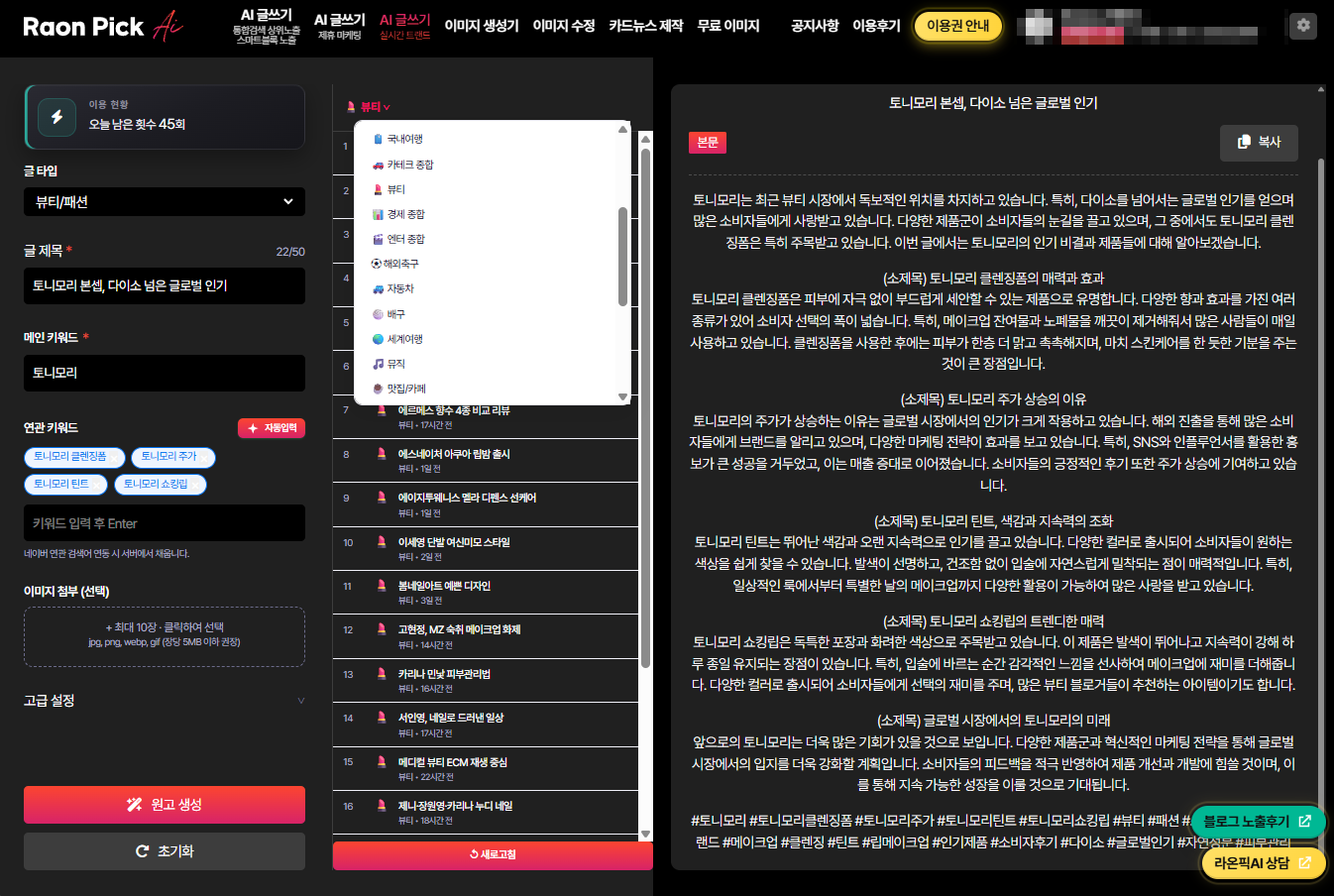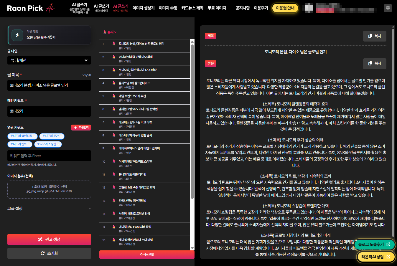 라온픽 AI 글쓰기 제휴마케팅(브랜드커넥트,쿠팡파트너스) 실시간트렌드 기능 추가 되었습니다.