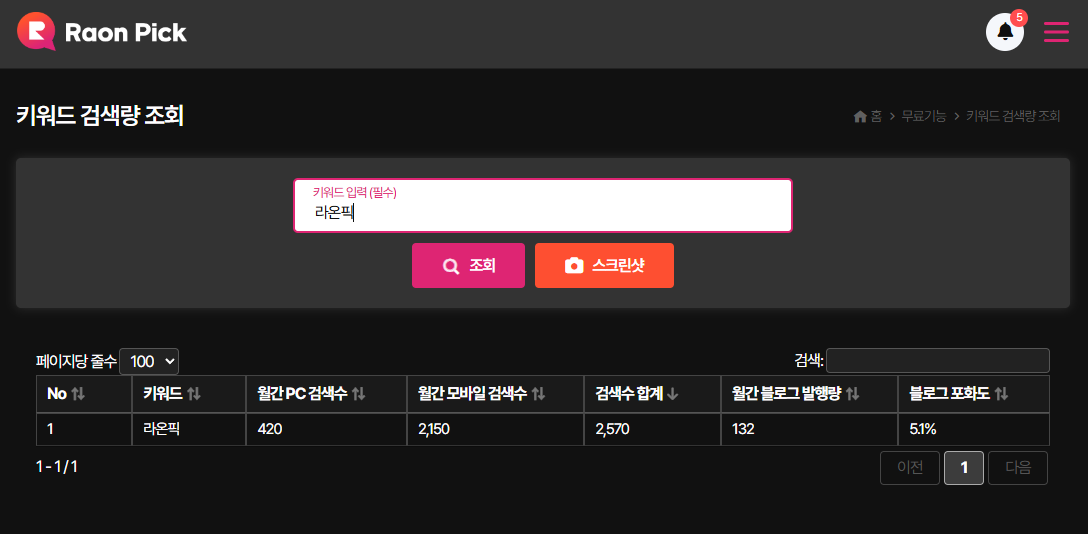 실제 네이버 검색 데이터값을 가져오므로 키워드검색량조회 툴중