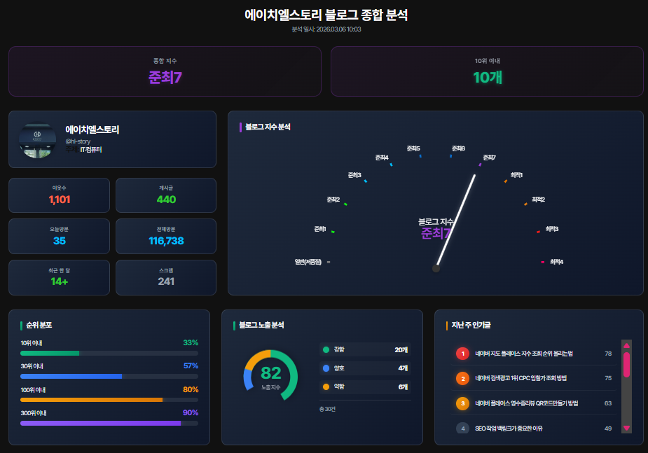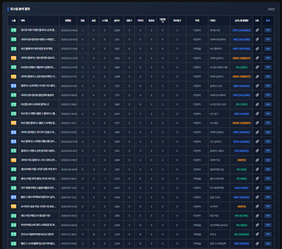 노출 지수 반영과 함께 블로그 분석에 필요한 다양한 데이터를 하나의 화면에서 확인할 수 있도록 개발되었습니다.